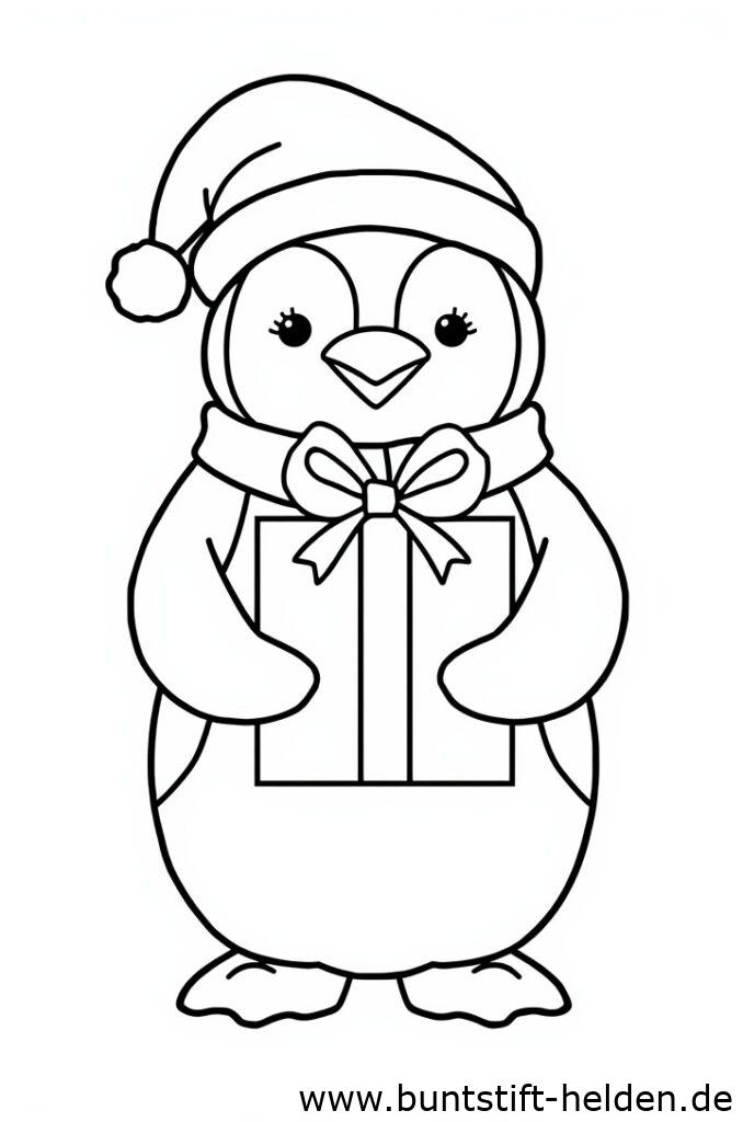 Ein tolles Ausmalbild mit Pinguin Mit Geschenk. Perfekt für Kinder zum Ausdrucken und Ausmalen. Lade dir die kostenlose Malvorlage jetzt als PDF herunter!